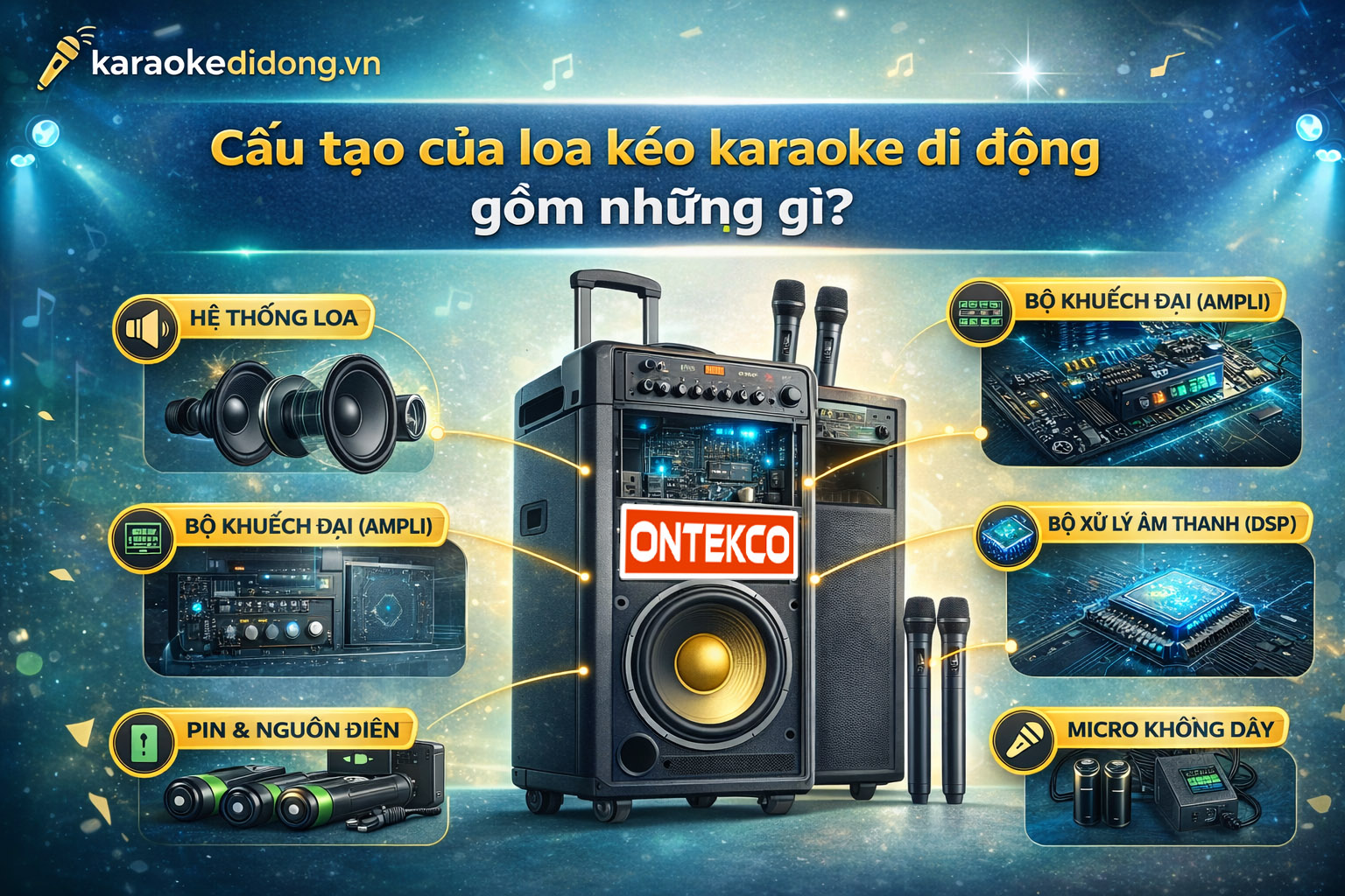 Một chiếc loa kéo karaoke di động thực chất là sự kết hợp của nhiều thành phần kỹ thuật khác nhau trong cùng một thiết bị.